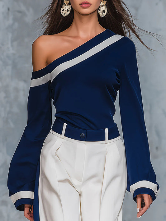 Vintage Charming One-shoulder Top And Wide-leg Pants Set