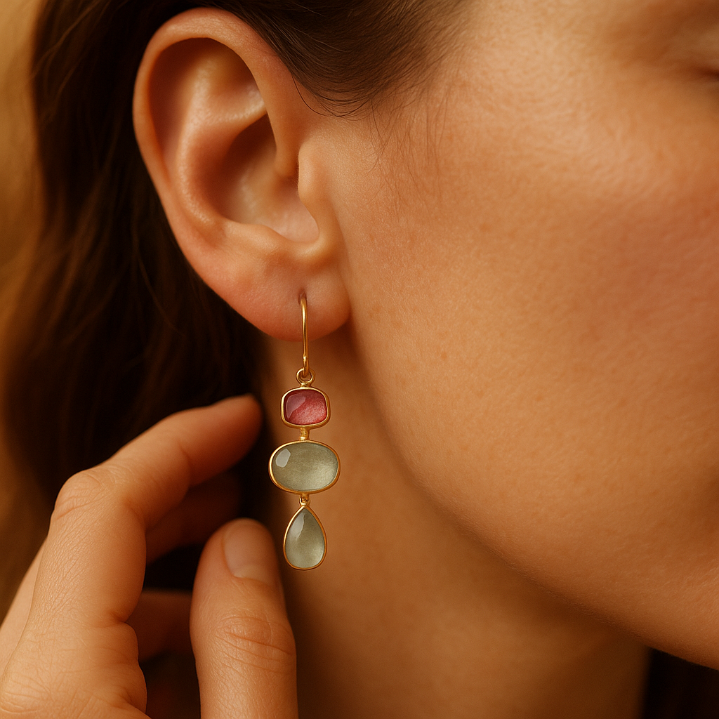 Experience the vibrant energy of the "Uffe" Earrings — a joyful celebration of freedom and beauty that stands out. Featuring three bold, colorful stones in red, green, and azure, these earrings create a perfect balance like a lively melody.