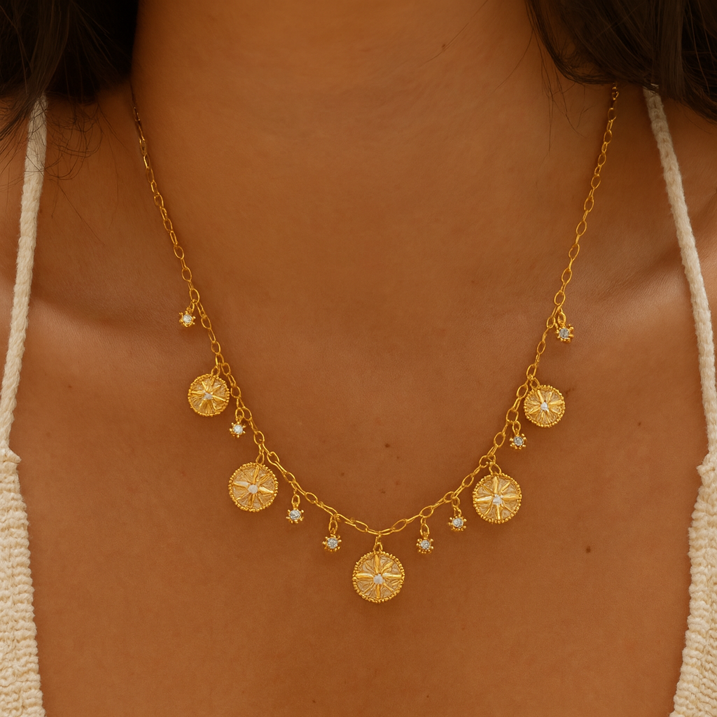 Zanzibar Necklace: Brighten your style with this stunning piece featuring hammered medals and delicate white pearls. Each textured medal catches the light, perfect for wearing alone for a refined look or layered for a bold, sunny effect.